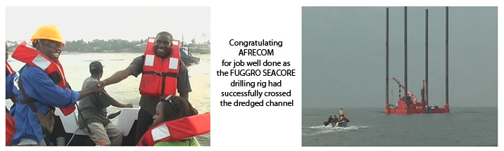 AFRECOM successfully dredged from December 2009 to January 2010, the pass from the Kribi channel to the estuary of the Kienke river in order to provide the drilling equipment of the FUGGRO SEACORE company with a draft of 6 meters by 100 meters which allowed him to access the site of the future Kribi deepwater port project.